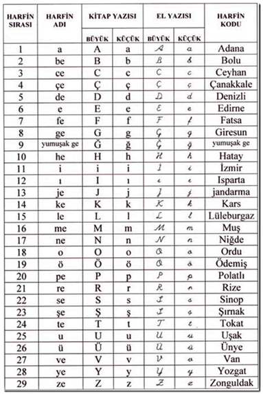 Türk alfabesindeki harflerin sıra sayıları, adları, kitap ve el yazısı biçimleri ile kodları[2] aşağıda belirtilmiştir: